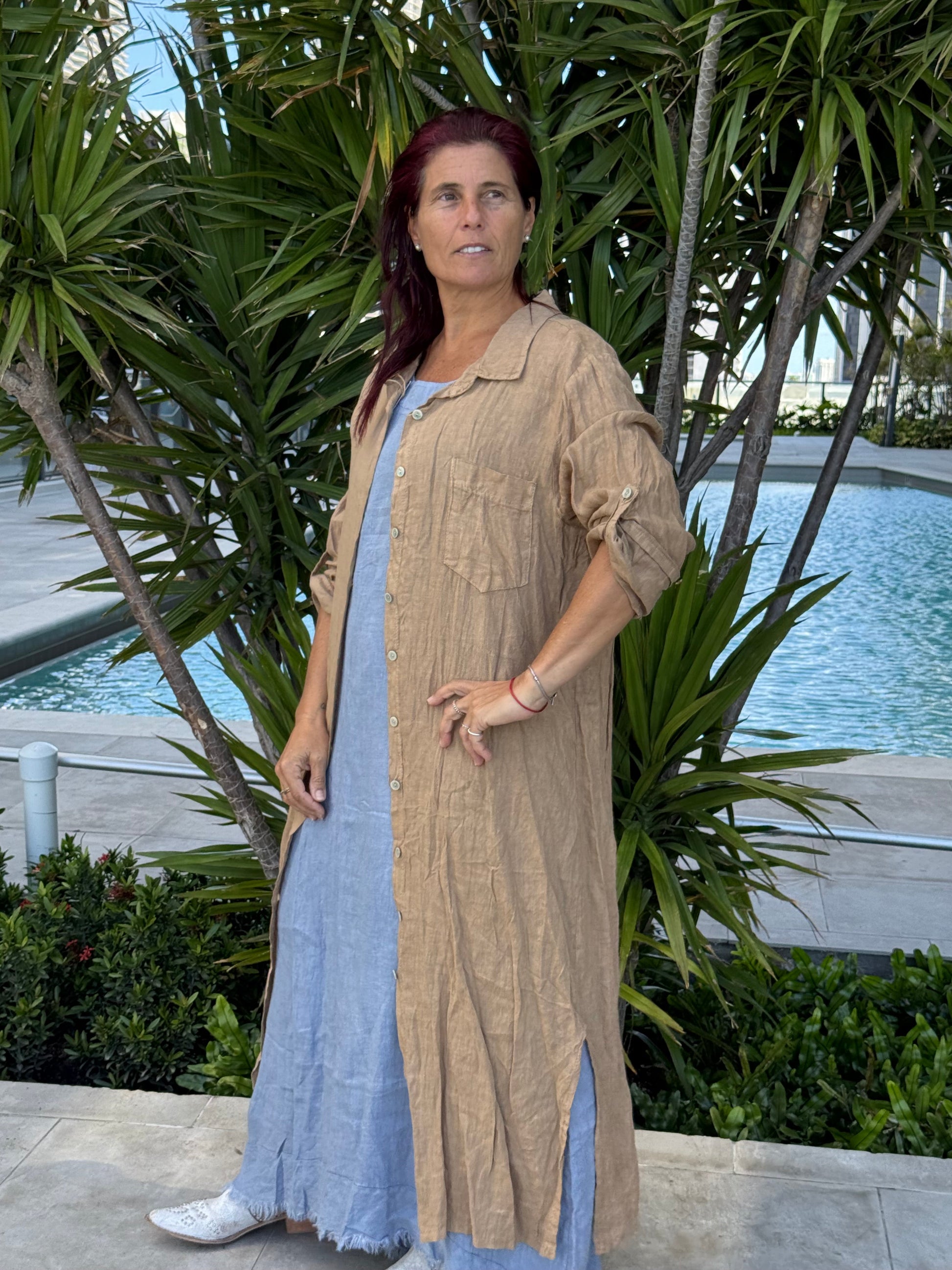 This 100% linen long shirt dress is designed for versatility and effortless style. Featuring a full button-down front, collar, and adjustable long sleeves that can be rolled up, it can be worn open as a lightweight cover-up or closed as a dress. The breathable fabric makes it perfect for layering across seasons. Note: Some variations may include a front-side pocket for added functionality.