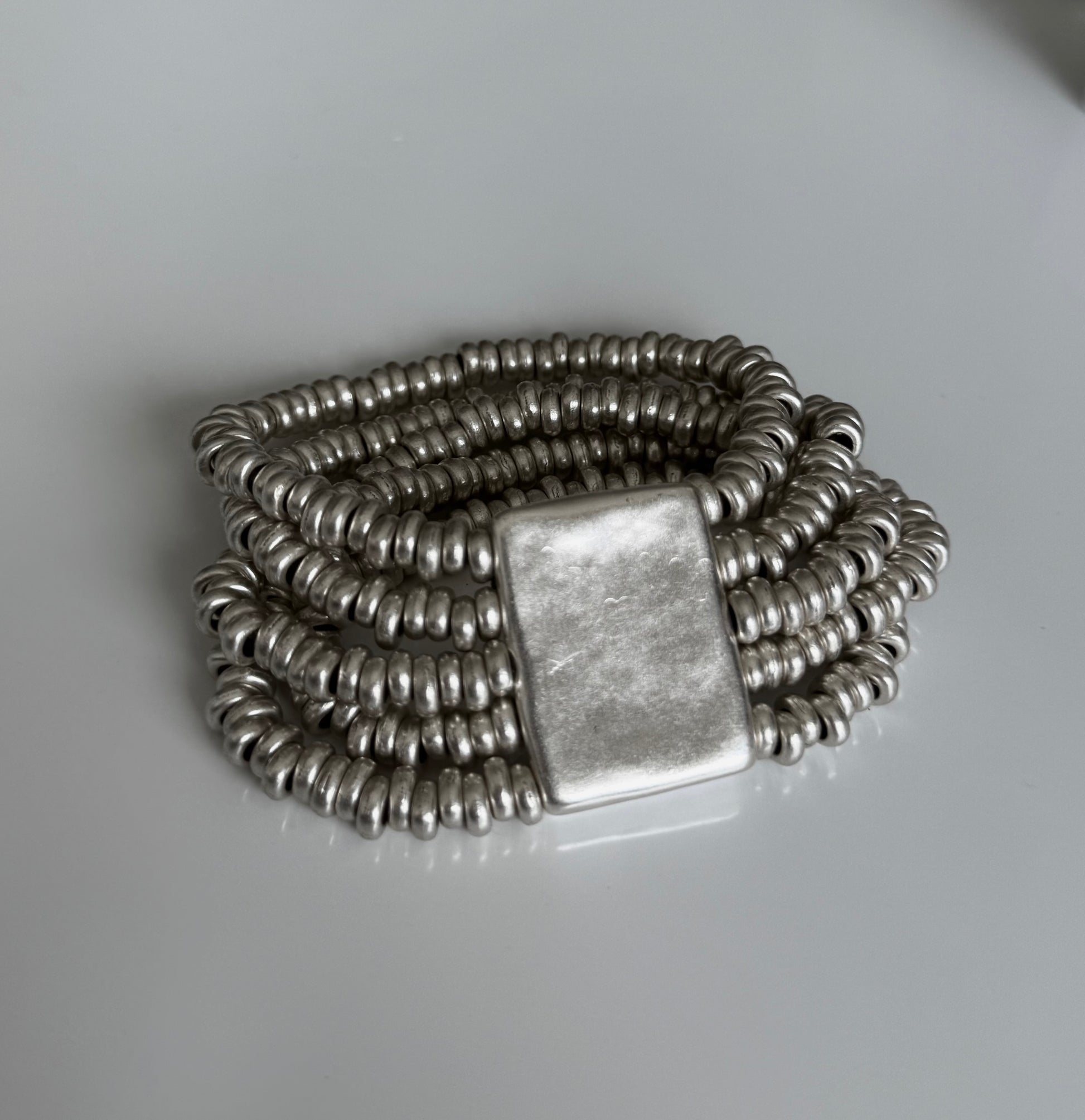 Minimalist yet bold, the Delphi Beaded Bracelet features smooth rounded beads and a rectangular silver plate centerpiece for a refined modern finish. Perfect for layering or wearing solo.