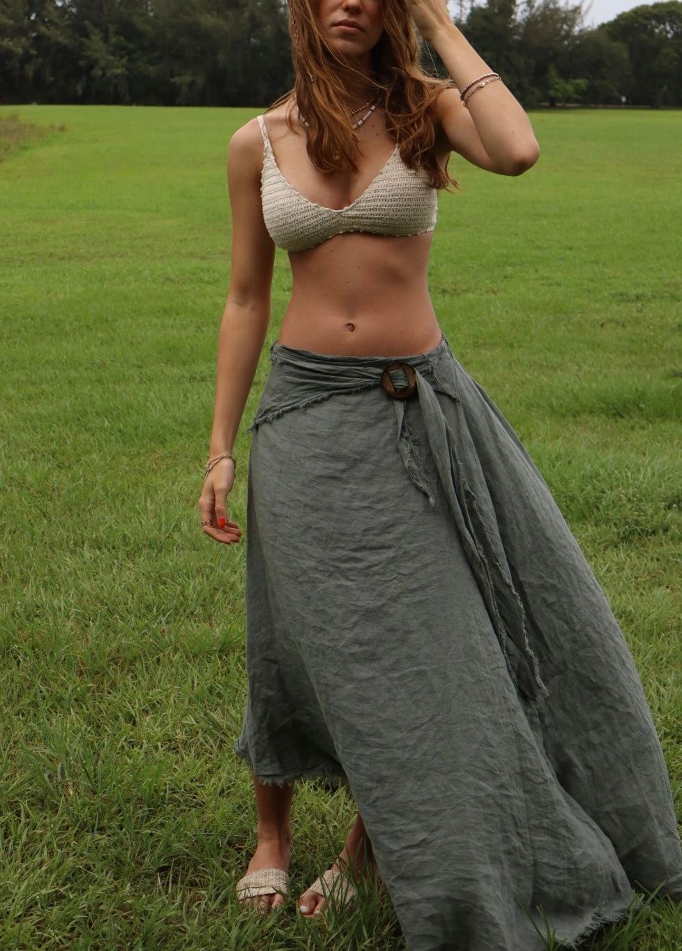 This 100% linen wrap skirt blends effortless style with a bohemian touch. Designed with a frayed hemline, an adjustable wrap-around tie with a wooden buckle, and a flowy silhouette, it offers both comfort and elegance. The breathable fabric and relaxed fit make it a versatile staple, perfect for casual outings or resort-inspired looks.