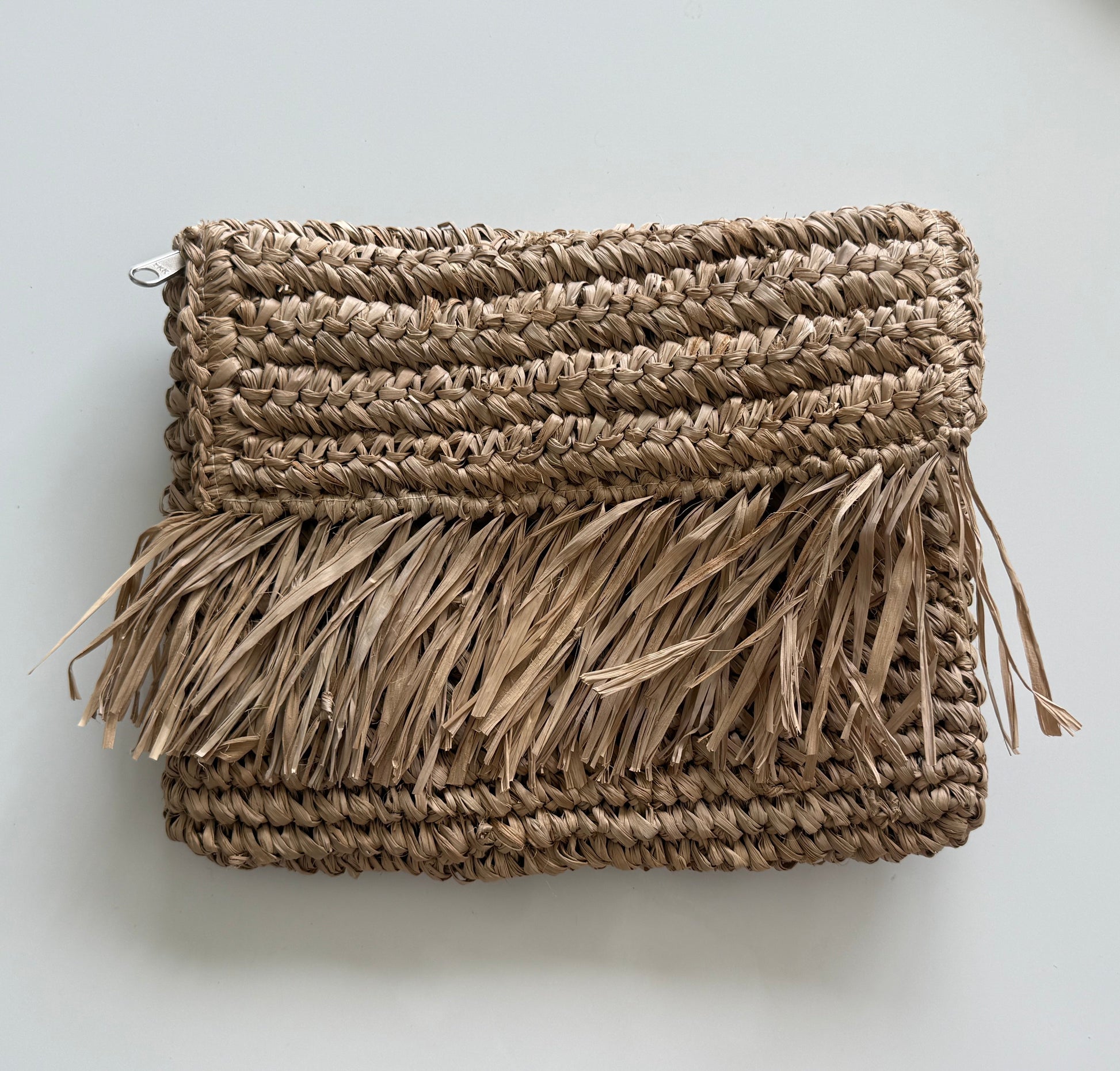 Natural raffia clutch, handcrafted in Bali. Features a zipper closure and fringe detailing for a balance of functionality and artisanal style. A versatile piece that transitions easily from day to night.