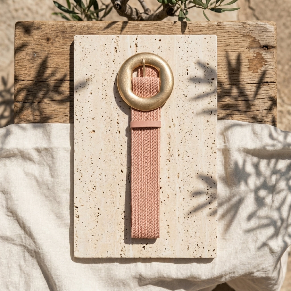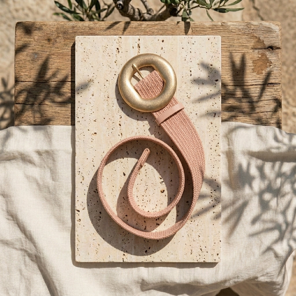 A statement elastic belt with a structured buckle, designed for a flexible and flattering fit. One size, fully adjustable, and a perfect accessory to enhance any linen piece.
