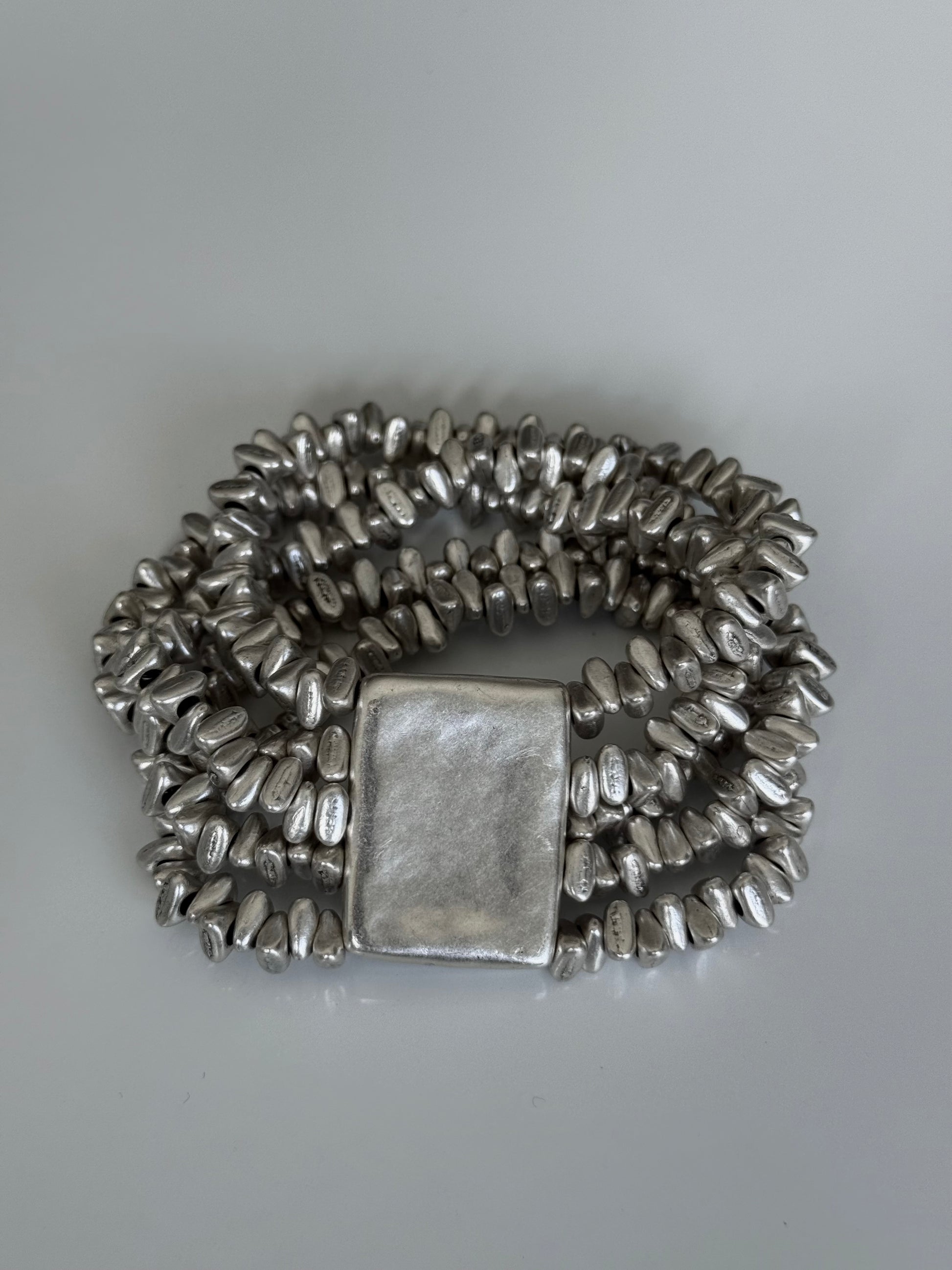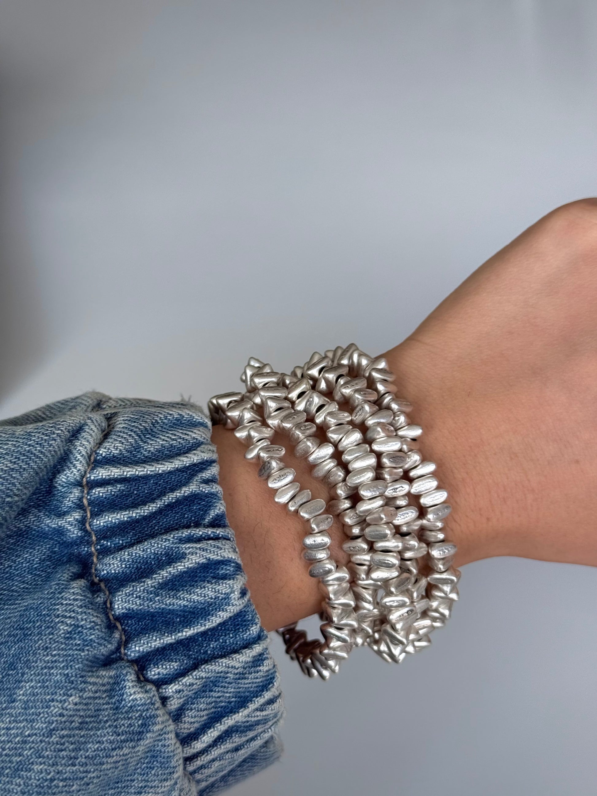 A multi-strand silver bracelet inspired by ancient craftsmanship. The Troy Layered Bracelet combines texture and volume, creating a timeless accessory that captures understated sophistication.